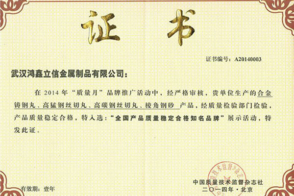 武漢鴻鑫立信金屬制品有限公司主要從事鋼丸、鋼絲切丸、鋼砂等除銹防腐耗材的生產(chǎn)和銷(xiāo)售。公司所有產(chǎn)品均通過(guò)ISO9001**質(zhì)量認(rèn)證,2014年更獲得了第三屆中國(guó)金屬磨料行業(yè)具有影響力品牌-華尊獎(jiǎng)。董事長(zhǎng)陳群芝女士從事行業(yè)17年來(lái)專(zhuān)注為客戶(hù)節(jié)約鋼丸消耗成本,2014年獲得了華尊獎(jiǎng)-中國(guó)品牌建設(shè)實(shí)踐百名創(chuàng)新很好企業(yè)家的榮譽(yù)。服務(wù)過(guò)的國(guó)家建設(shè)項(xiàng)目有:北京鳥(niǎo)巢體育館、遼寧號(hào)航母、杭州灣跨海大橋、南海軍艦、成都雙流**機(jī)場(chǎng)、南車(chē)集團(tuán)動(dòng)車(chē)檢測(cè)中心、武漢火車(chē)站、武漢天興洲大橋等,同時(shí)服務(wù)的行業(yè)囊括橋梁制造、船舶制造、汽車(chē)制造、火車(chē)車(chē)輛制造、大理石打磨、鑄件清砂、各種機(jī)械制造表面清理等。鴻鑫鋼丸,值得信賴(lài)。